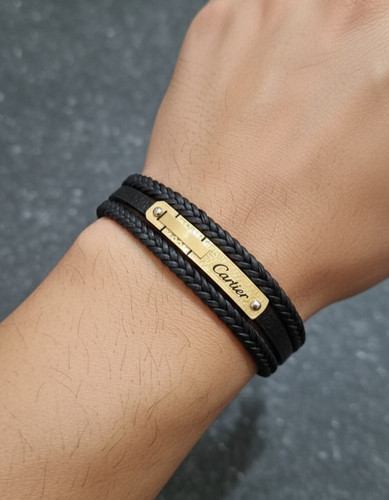 دستبند چرمی مردانه ۳ لاین با پلاک کارتیر طلایی و قفل کتابی