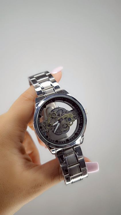 این مدل ساعت مردانه با بند استیل تکرنگ طراحی شده و ظاهر ساده، شیک و کاملاً مردانهای دارد. قاب پشت ساعت شیشهای است و امکان مشاهده مکانیزم داخلی را فراهم میکند؛ ویژگیای خاص که معمولاً در ساعتهای لوکستر دیده میشود.