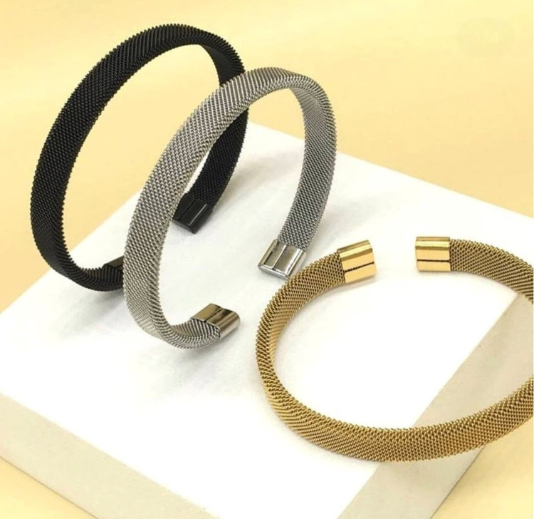 فلز استیل، حس سنگینی و اصالت دارد و در عین حال برای استفاده روزمره کاملاً کاربردی است. این مدل برای ست شدن با ساعت، انگشتر یا حتی استایل رسمی مناسب بوده و جلوه تمیز و لوکس به استایل میدهد.