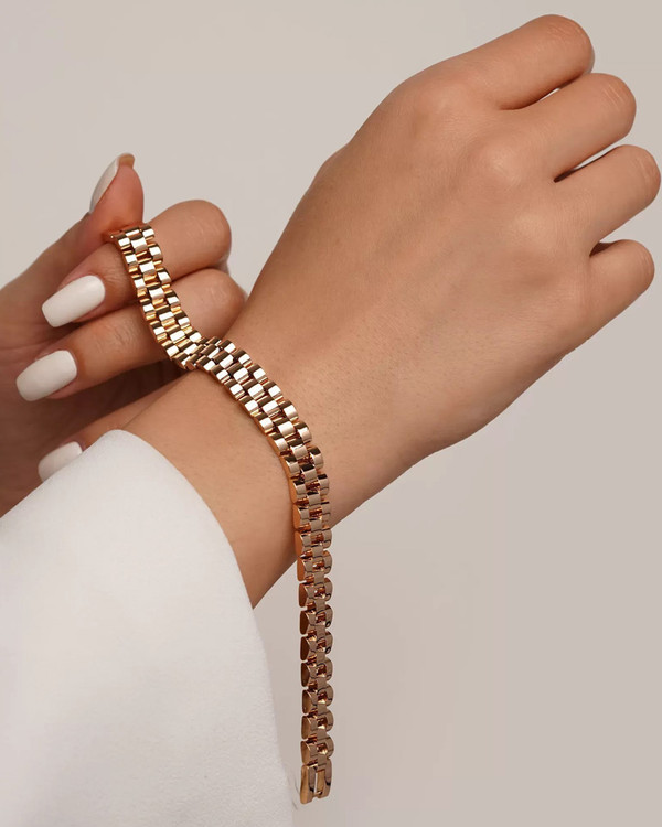 این دستبند زنانه از برند Xuping با الهام از طرح “رولکس” طراحی شده است؛ گزینهای که ترکیبی از طراحی مدرن، ظرافت و قابل ست بودن را در خود دارد. با ظریف بودن فرم، این دستبند میتواند بهعنوان زیور جداگانه یا همراه با انگشتر، ساعت یا گردنبند مورد استفاده قرار گیرد و استایل شما را تکمیل کند. فلز بهکار رفته بهگونهای انتخاب شده که ظاهر تمیز و مرتب داشته باشد.