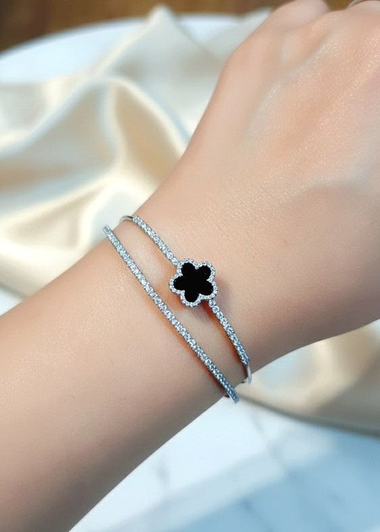 بنگل دولاین ونکلیف، ترکیبی هنرمندانه از ظرافت و درخشندگی است. لاین اصلی این مدل با پلاک محبوب Vancleef پنجپر تزئین شده که در دو طرف آن نگینهای ریز و براق قرار گرفته و جلوهای لوکس ایجاد میکند.