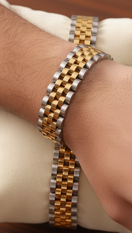 فرم رولکسگونه و طراحی دورنگ، این دستبند را تبدیل به اکسسوریای میکند که حتی در نگاه اول، کیفیت بالای آن توجه را جلب میکند. سطح استیل صاف و پرداختشده، احساس راحتی روی پوست ایجاد میکند و با ساعت و انگشترهای فلزی ترکیب بسیار هماهنگی دارد.