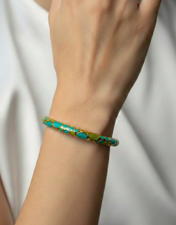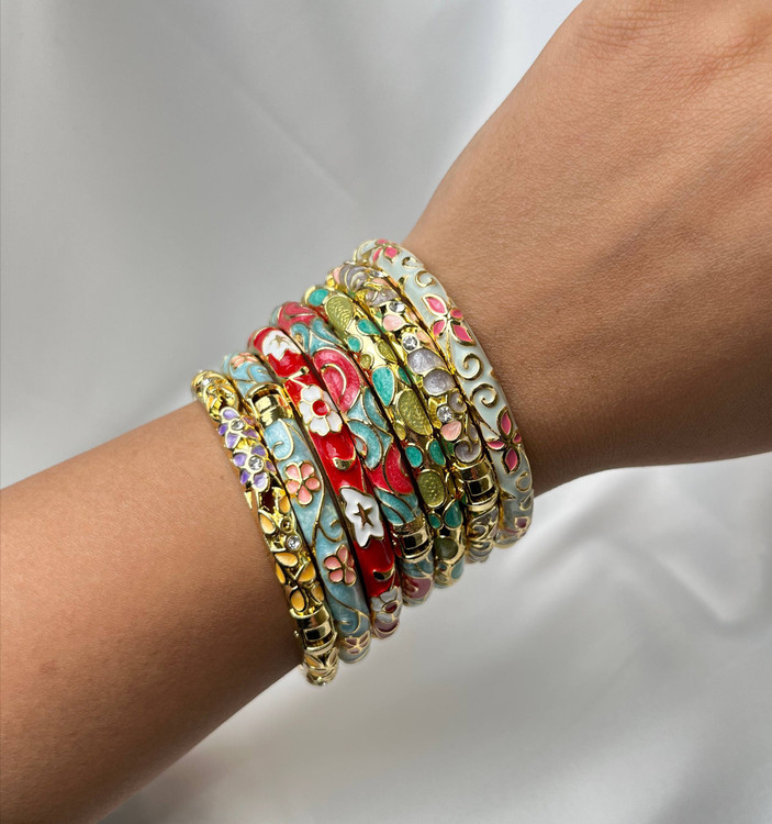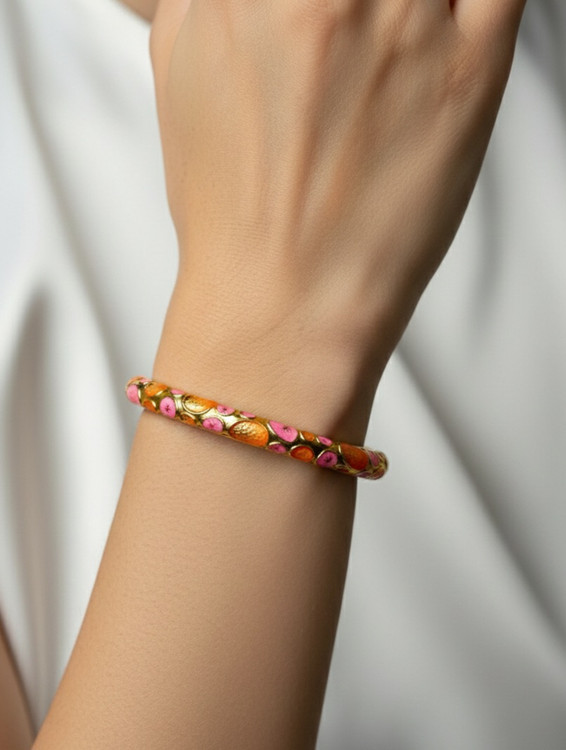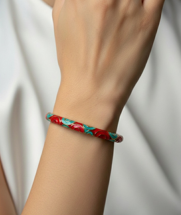 بافت مینایی این دستبند و رنگهای زنده آن، امکان استفاده در استایلهای مهمانی، روزانه و فشن را فراهم میکند. هر بار که نور روی آن میتابد، نقوش مینایی با درخشش ملایمی دیده میشوند که به زیبایی دستبند اضافه میکند.