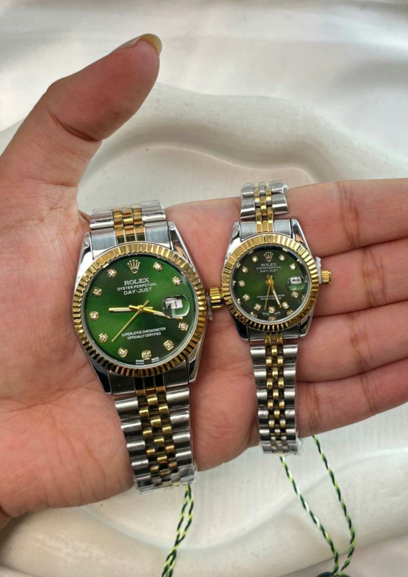 Rolex Green Dial Couple Watch Set – Stainless Steel with Date Display