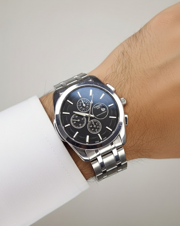 ساعت مردانه استیل کلاسیک — مدل تیسوت با صفحه مشکی و نمایش تاریخ