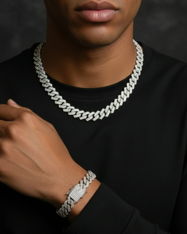 ست نقرهای نگیندار با اندازه و طراحی استاندارد — دستبند ۲۲ cm و گردنبند ۵۲ cm — مناسب طیف وسیعی از سایز مچ و گردن است. پوشش کامل نگین روی کل ست، جلوهای لوکس و درخشان میدهد؛ و پهنای ۱۳ mm تعادلی بین ضخامت چشمگیر و ظرافت ایجاد میکند. قفل فشاری ضامندار راحتی و امنیت استفاده را تضمین میکند، در حالیکه طراحی یونیسکس آن را برای هر جنسیتی کاربردی میسازد. این ست برای کسانی که خواهان ترکیبی از براقیت، دوام و سبک فشن هستند، انتخابی هوشمندانه است.