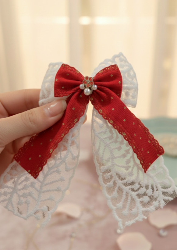 گیره مو یلدایی — پاپیون قرمز با مروارید، قفل فرانسوی، اکسسوری شب یلدا