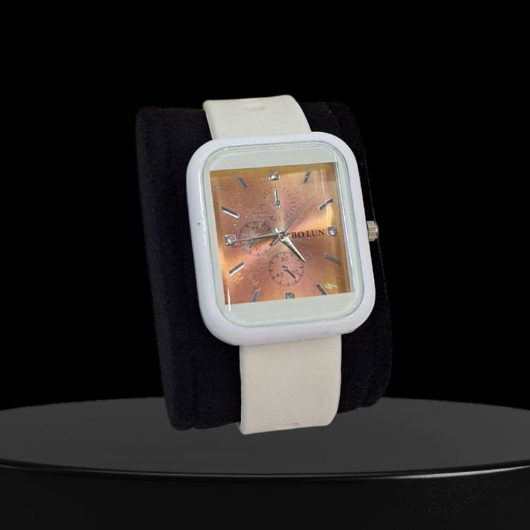 ساعت دخترانه بولون | صفحه مستطیلی مسی نگیندار بند سیلیکونی سفید
