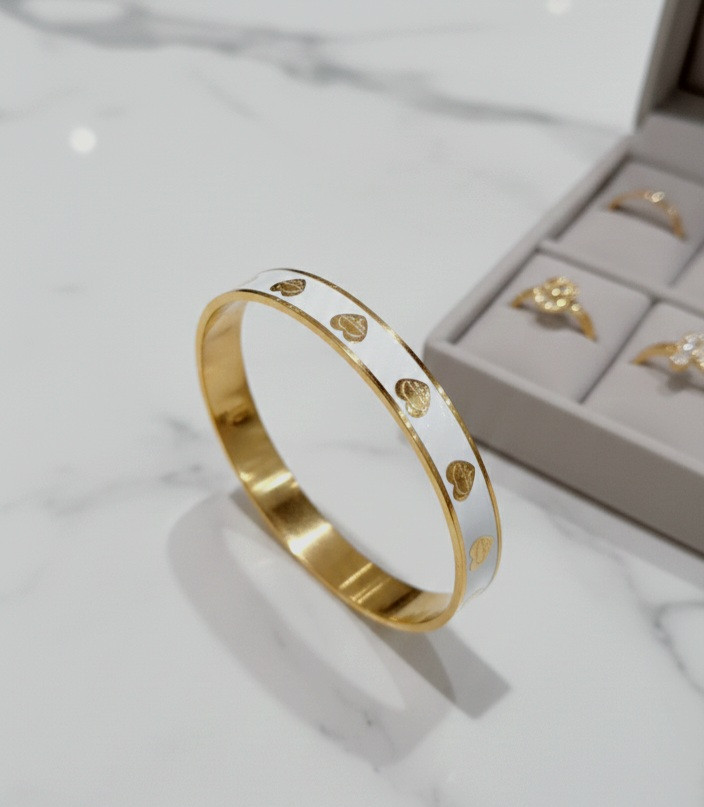 این مدل نسبت به بنگلهای ساده موجود در بازار، جلوهی بصری لوکستری ارائه میدهد؛ ترکیب طلایی براق با نوار سفید و قلبهای حکشده، محصول را بهنوعی در دستهی کارهای فشن اما ظریف قرار میدهد. فرم بیضی باعث میشود روی دست بهتر فیت شود و استیل ضدزنگ آن در برابر تغییر رنگ مقاومت خوبی نشان میدهد. در مقایسه با نمونههای مشابه با رنگآمیزی ضعیف، این مدل از آبکاری تمیز و بدون لکه برخوردار است.