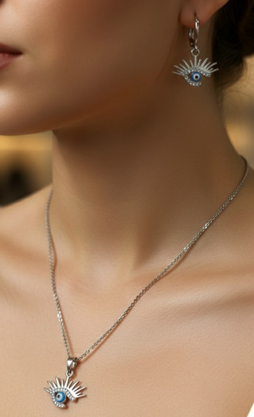 YSX Silver Stainless Steel Evil Eye Necklace & Earrings Set — Minimal Protective Design