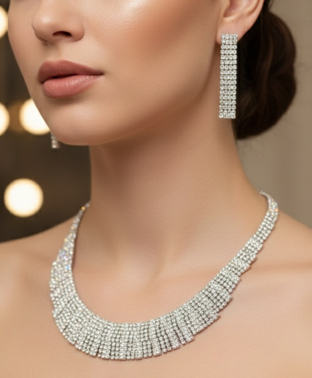 این سرویس با طراحی فول نگین و رنگ نقرهای، نسبت به زیورآلات معمول بازار جلوه متمایزتر و شیکتری دارد. نگینهای اتمی با دقت قرار گرفتهاند و سطح کاملی از درخشش ایجاد میکنند. اگرچه قیمت مناسبتری دارد، احساس خرید یک زیور جواهری را منتقل میکند. برای کسانی که دنبال ست زیبا، چشمگیر و اقتصادی هستند — این گزینه یک انتخاب هوشمندانه است.