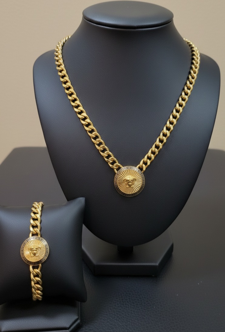 این نیمست شامل دستبند و گردنبند با طرح زنجیر کارتیر و پلاکهای طلایی ورساچه است که هارمونی کامل بین دو اکسسوری را ایجاد میکند. استفاده از رنگ طلایی براق در کنار طراحی کلاسیک کارتیر، باعث شده این ست هم برای استفاده روزمره و هم برای استایلهای شیک و مهمانی انتخابی قابل اعتماد باشد. امکان تنظیم طول در هر دو قطعه، آزادی عمل بیشتری در استفاده ایجاد میکند.