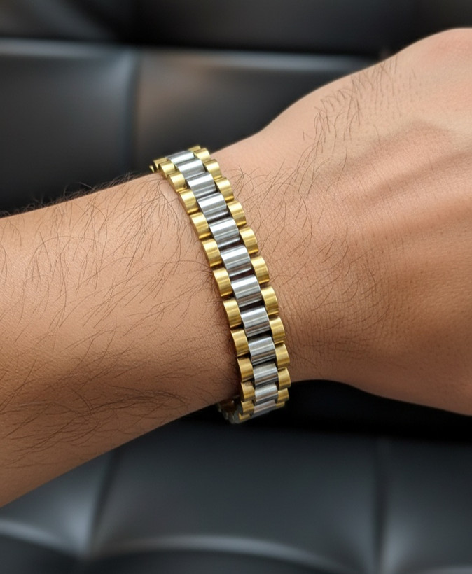 در مقایسه با بسیاری از دستبندهای طرح رولکس موجود در بازار، این مدل به دلیل ترکیب دو رنگ گلد و سیلور جلوه متفاوتتری دارد. پهنای ۱۰ میلیمتری آن باعث میشود روی دست بهخوبی دیده شود بدون اینکه بیشازحد اغراقآمیز باشد. قفل کتابی تاشو نیز نسبت به قفلهای ساده، امنیت و دوام بیشتری در استفاده روزمره فراهم میکند.
