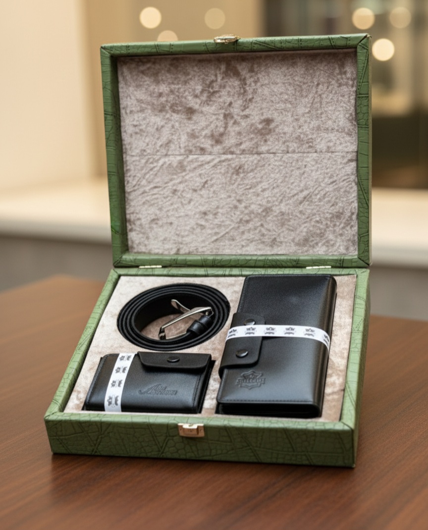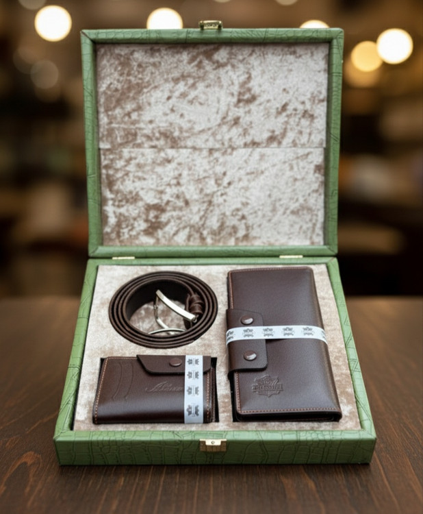 ست کیف پول و کمربند و جاکارتی چرم طبیعی بز با جعبه قفل‌دار هدیه