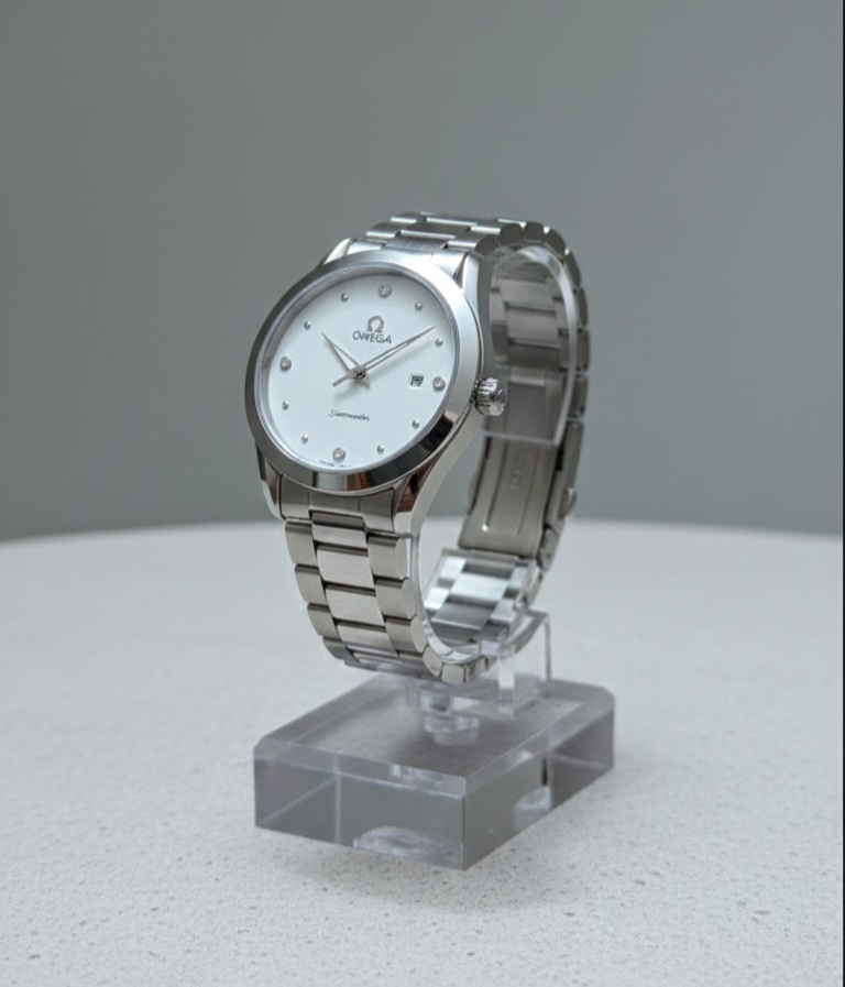 این مدل از امگا ترکیبی از ظاهر کلاسیک و کاربرد روزمره را ارائه میدهد. صفحه سفید با نمایش تاریخ خوانایی فوقالعادهای دارد و بند استیل با قفل تاشو ضامندار، تعادل بین راحتی و امنیت را برقرار میکند. نسبت به همردههای غیربرند یا برندهای اقتصادی، این ساعت با برند معتبر امگا ارزش ظاهری و ادراکی بالاتری دارد.