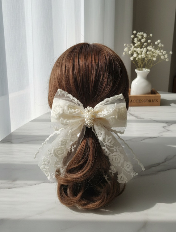 این گیره پاپیونی برای افرادی مناسب است که به جزئیات استایل اهمیت میدهند. ترکیب گیپور، مروارید و نگین، آن را به گزینهای مناسب برای مراسم، مهمانی و حتی هدیه تبدیل کرده است. طراحی دنبالهدار باعث میشود بدون نیاز به اکسسوری اضافی، جلوهای کامل به موها بدهد.