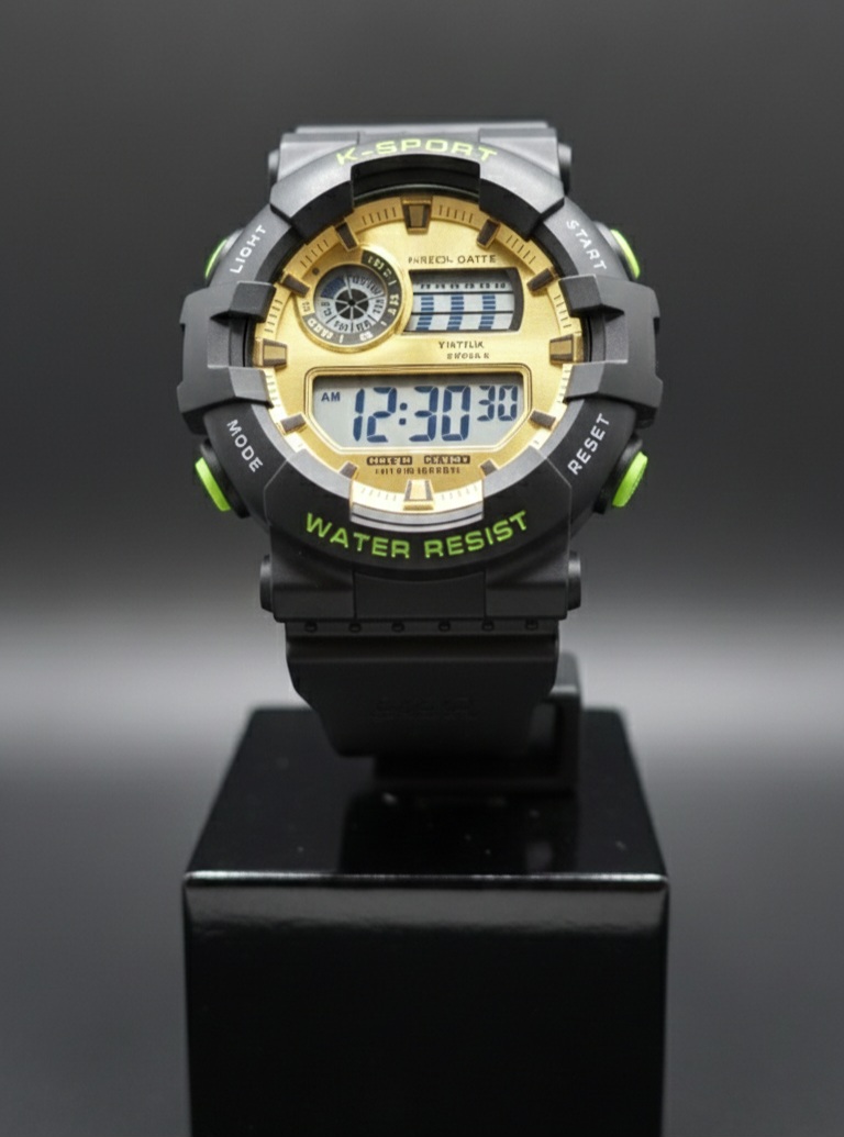 ساعت دیجیتال اسپرت COYOTE با رنگ مشکی و صفحه طلایی، طراحی جوانپسند و در عین حال کاربردی دارد و برای استفاده روزمره نوجوانان، جوانان و حتی بزرگسالان مناسب است. نوع نمایش کاملاً دیجیتال بوده و امکاناتی مانند نمایش تاریخ، روزهای هفته، آلارم و چراغ شب را در اختیار کاربر قرار میدهد. این مدل با دکمههای سبز فسفری عرضه میشود و یک نمونه مشابه با دکمههای قرمز نیز موجود است تا امکان انتخاب بر اساس سلیقه فراهم باشد. قفل سگکی دو پین استفاده از ساعت را ساده و مطمئن میکند.