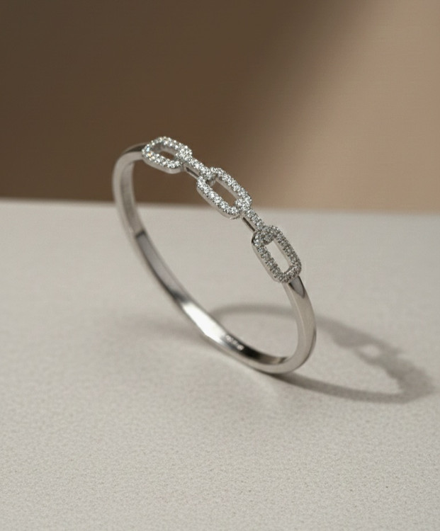 این بنگل سیلور از برند ژوپینگ با طراحی بیضی و ساختار بازشونده از بغل، گزینهای متمایز برای افرادی است که به زیورآلات خاص و براق علاقه دارند. سطح بنگل با حلقههایی به فرم مستطیلی طراحی شده که بهصورت کامل نگینکاری شدهاند و جلوهای منظم و لوکس ایجاد میکنند. آبکاری نقرهای براق روی بدنه استیل، ظاهر یکدست و درخشانی به محصول داده است.