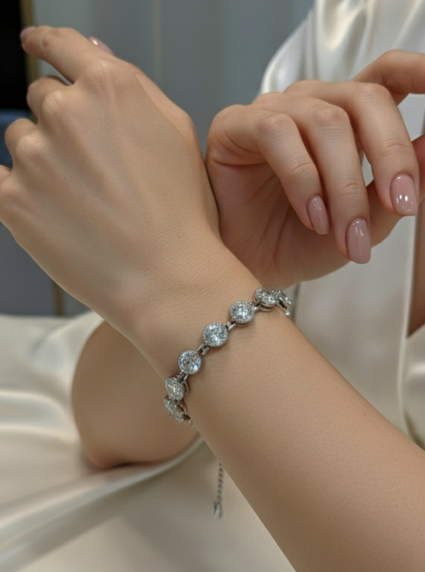 این دستبند انتخابی مناسب برای استایلهای مجلسی، نیمهمجلس و ترکیبهای خاص است. بهتنهایی نقش اکسسوری اصلی را ایفا میکند و بهتر است با زیورآلات سادهتر ست شود تا جلوه نگینها بهخوبی دیده شود. در استایلهای مینیمال، بهعنوان نقطه تمرکز دست بسیار مؤثر عمل میکند.