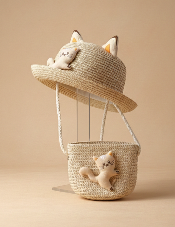 در مقایسه با ستهای بچگانه با پارچههای متراکم، استفاده از بافت کنفی حصیری در این مدل باعث سبکتر شدن محصول و تهویه بهتر شده است. فرم کلاه بهخوبی حفظ میشود و در عین حال خشکی یا سنگینی نمد را ندارد. طراحی برجسته گربه بدون شلوغی، جذابیت بصری ایجاد میکند و زیپ کیف نسبت به مدلهای بدون بستهشدن، کاربردیتر است.
