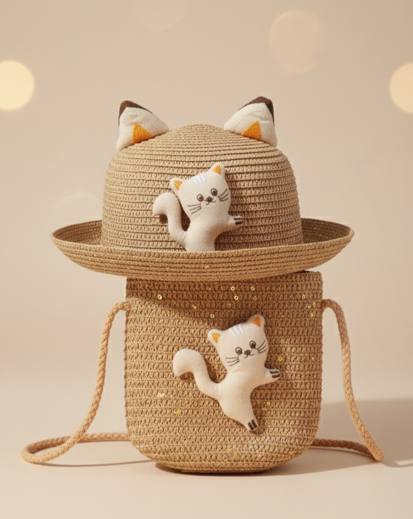 ست کیف و کلاه بچگانه طرح گربه با کلاه لبهدار