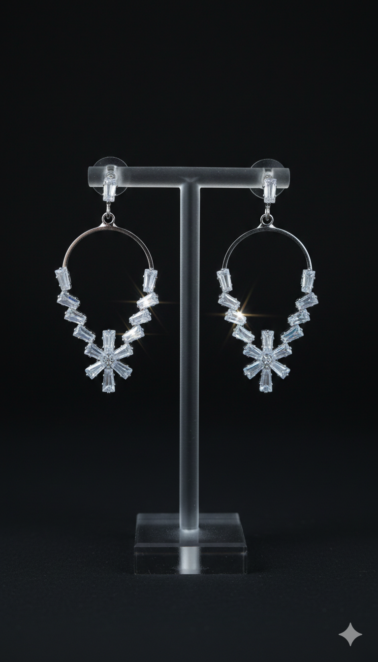 گوشواره مجلسی میخی با طراحی اشک وارونه که تمرکز اصلی آن روی فرم کشیده و درخشش نگینهاست. نگین اتمی ستارهای ششپر در بخش پایینی، همراه با نگینهای مستطیلی روی بدنه، جلوهای منظم و متعادل ایجاد کرده است. پایه استیل رنگ سیلور باعث میشود گوشواره هم برای استفاده مجلسی و هم برای ستکردن با اکسسوریهای استیل انتخابی امن و کاربردی باشد.