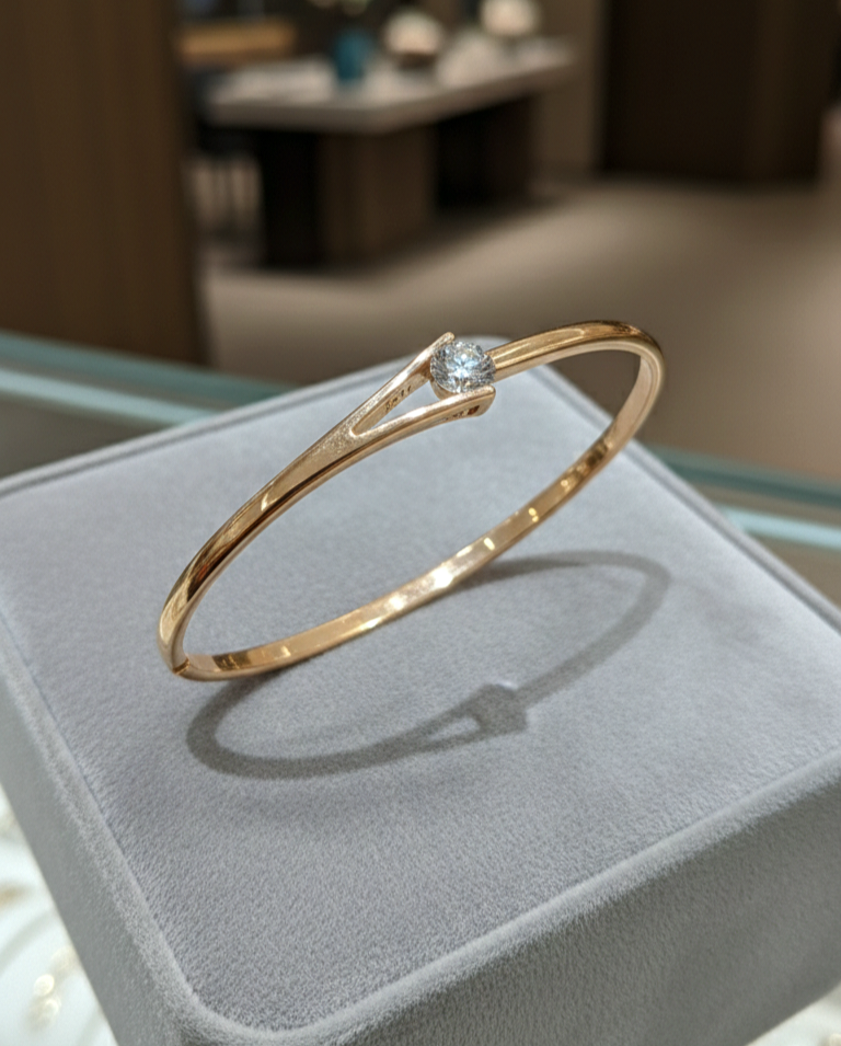این بنگل بیشتر در استایلهای مجلسی و نیمهرسمی میدرخشد. کنار ساعت طلایی یا دستبندهای ظریف ترکیب جذابی میسازد و میتواند به تنهایی هم نقش قطعه اصلی اکسسوری دست را بازی کند.