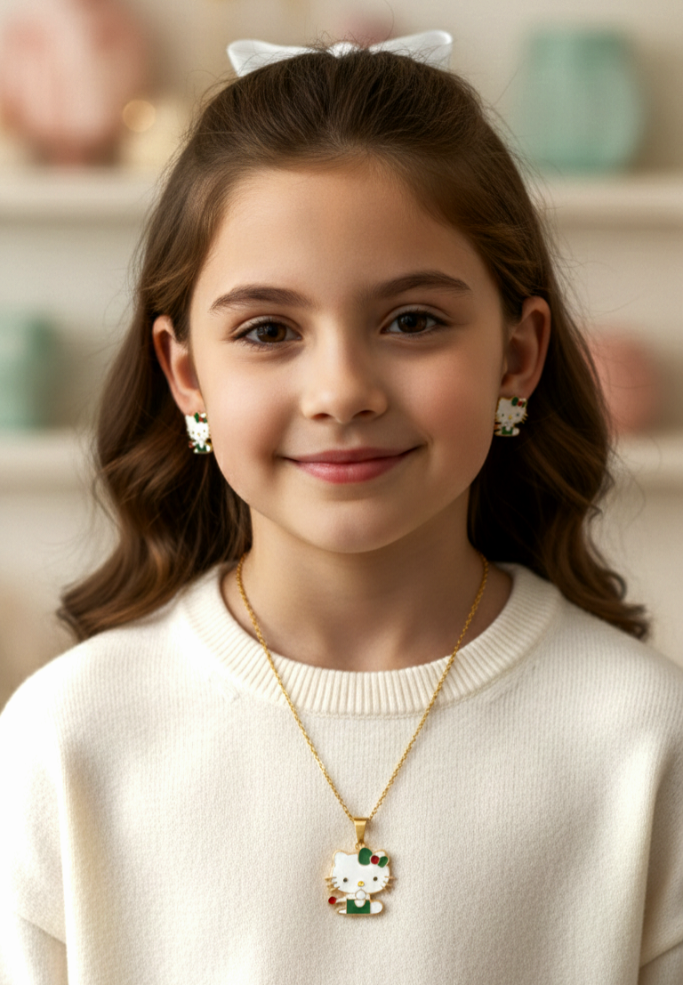 در نیمستهای بچگانه، مهمترین نکته هماهنگی طراحی و وزن مناسب است. این مدل با ابعاد استاندارد پلاک و گوشواره، نه بیش از حد بزرگ است و نه خیلی کوچک که دیده نشود. قفل خرچنگی زنجیر نیز اتصال مطمئنتری نسبت به قفلهای ساده ایجاد میکند. طراحی کیتی آن را به گزینهای محبوب برای هدیه تبدیل میکند.