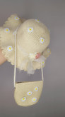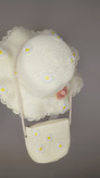 🔷 در مدل اول، کلاه لبهدار گرد با قطر ۳۲ سانتیمتر طراحی شده و با گل بابونه، روبان و پاپیون تزیین شده است.