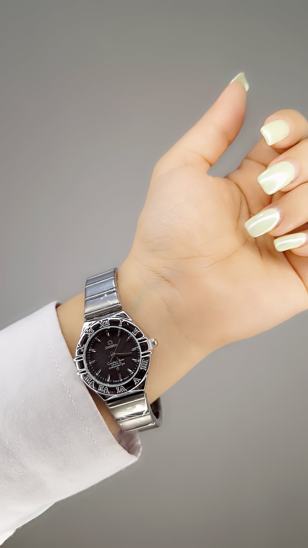 ساعت زنانه امگا مدل کانسلیشن یکی از ظریفترین و شیکترین ساعتهای زنانه طرح کلاسیک است. رنگ نقرهای درخشان در کنار صفحه ذغالی تیره، تضادی زیبا و چشمگیر ایجاد کرده است. این مدل با قطر صفحه کوچک (۲ سانتیمتر) مناسب کسانی است که ساعت ظریف و مینیمال میپسندند. بند استیل مقاوم و ضد زنگ، این ساعت را به گزینهای ایدهآل برای مهمانی، محل کار و حتی استفاده روزمره تبدیل کرده است.